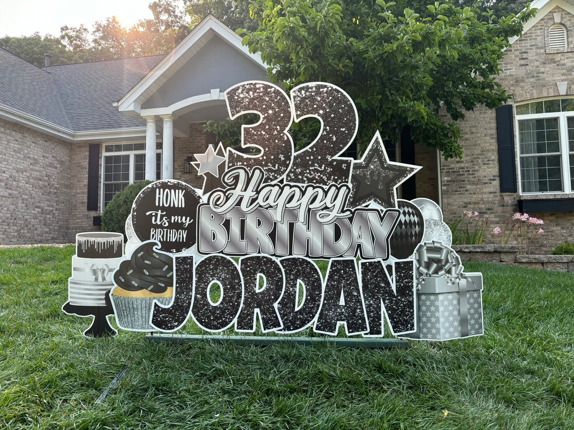 All displays are specially designed for you and your celebration, there may be slight variations of flair placement within the sign based on the name length, option choices and terrain. Displays are typically 8' wide and about 5-6' tall. We will make your display look fabulous!