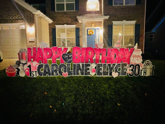 All displays are specially designed for you and your celebration, there may be slight variations of flair placement within the sign based on the name length, option choices and terrain. Displays are typically 10' wide and about 5-6' tall. We will make your display look fabulous!