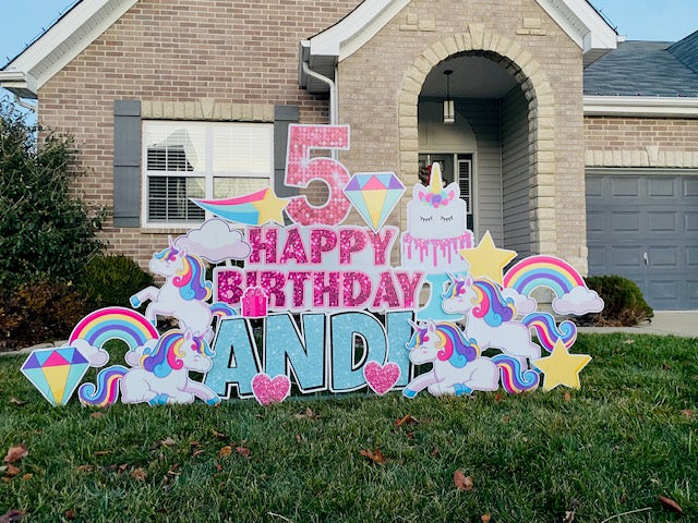 All displays are specially designed for you and your celebration, there may be slight variations of flair placement within the sign based on the name length, option choices and terrain. Displays are typically 8' wide and about 5-6' tall. We will make your display look fabulous!