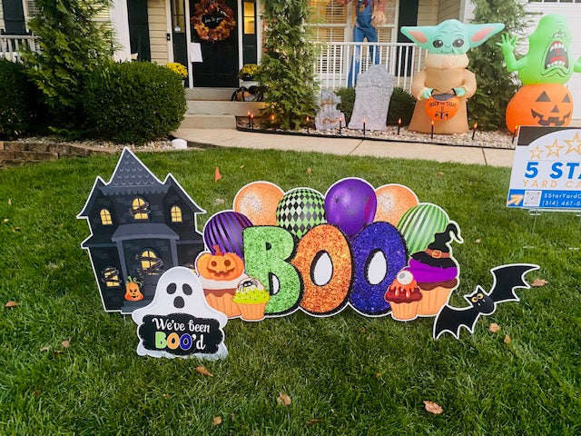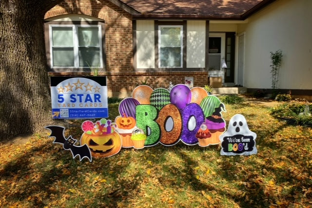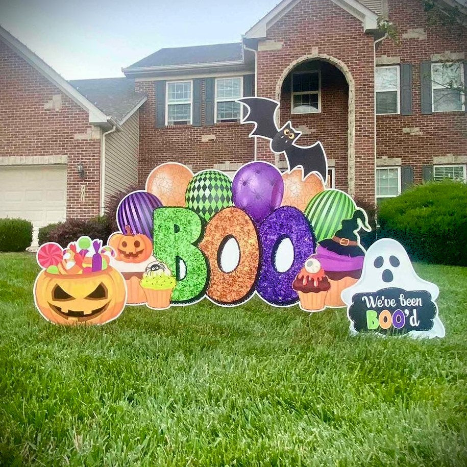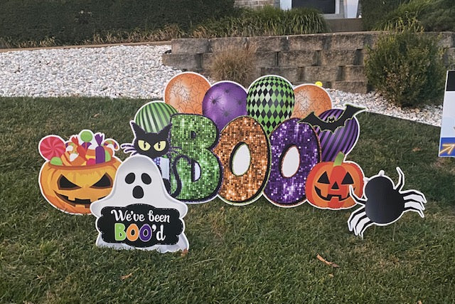 A BOO! is a single day mini sign set up in the front yard at dark, left with a bag of treats for 2 children and that's no trick. The sign is picked up the next day to travel to its new BOO! location. (Additional treat bags $5 each)